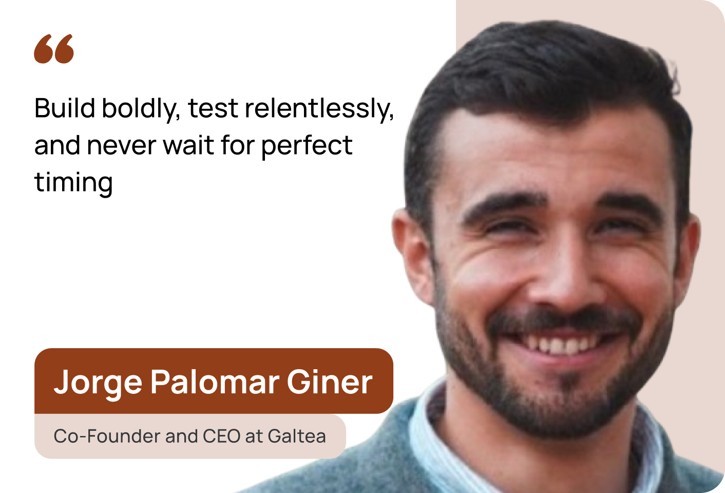Jorge didn’t just wake up one day and decide to be a founder—his mindset was shaped long before Galtea came to life. A lifelong athlete, he's used to pushing limits and chasing goals, and that competitive streak didn’t fade when he stepped off the field. “Being active in sports helped me stay ambitious and hardworking,” he says. That same drive shows up in how he tackles business: set a goal, work hard, push forward. His technical background as a computer engineer also gave him a powerful edge—not just in building a product, but in approaching every business challenge like a puzzle to be solved.
